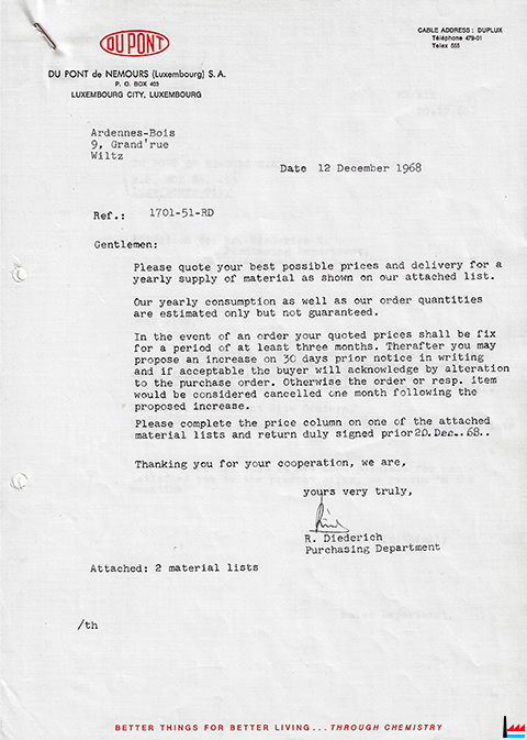 12.12.1968 - Du Pont de Nemours, Luxembourg, S.A. - Demande de prix adressée à la société anonyme Ardennes-Bois, Wiltz, 9, Grand-rue (Collection Ph. Aschman)