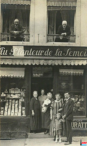 La famille Aschman-Huss devant le magasin Au Planteur de la Semois à Luxembourg-Ville en 1924. À la fenêtre au premier étage, à droite: M. Auguste Aschman (* 14.06.1848; † 27.07.1930), ingénieur en retraite, ancien chef du bureau technique à l’Usine de Dudelange.