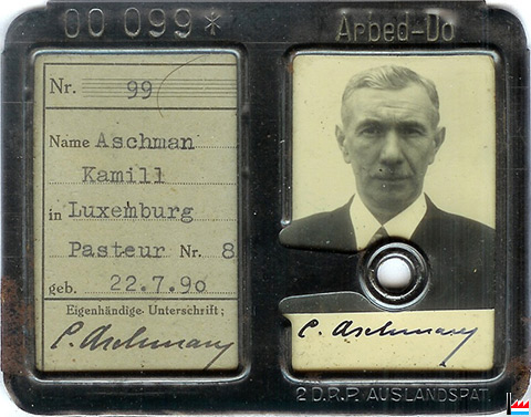 2. Weltkrieg: D.R.P. - Ausweis - ARBED-Do N°099 - 6.5.1941:Name Aschman Kamill in Luxemburg Pasteur N° 82 geb. 22.7.1890 (Collection famille Aschman-Bodson, Luxembourg)