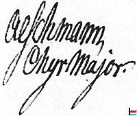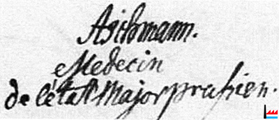 | 30.11.1821 | ![]() (…) Jean Aeschmann, chirurgien au service de prusse (…) (signature : Aeschmann Medecin de l'état Major prussien.) (Acte de naissance de Bernard Auguste Aeschmann du 30.11.1821). |