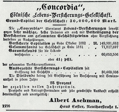 | 30.5.1882 | Avis. - Assurances. Par arrêté royal grand-ducal du 4 mai courant la compagnie d'assurances sur la vie dite « Concordia » de Cologne a été autorisée à étendre ses opérations sur le Grand-Duché. Cette compagnie a déposé dans la caisse de l'État le cautionnement exigé par les dispositions sur la matière. M. Albert Aschman en cette ville a été agréé comme agent général de cette compagnie pour le Grand-Duché. Luxembourg, le 30 mai 1882. Pour le Directeur général des finances : Le Conseiller de Gouvernement, M. MULLENDORFF. |