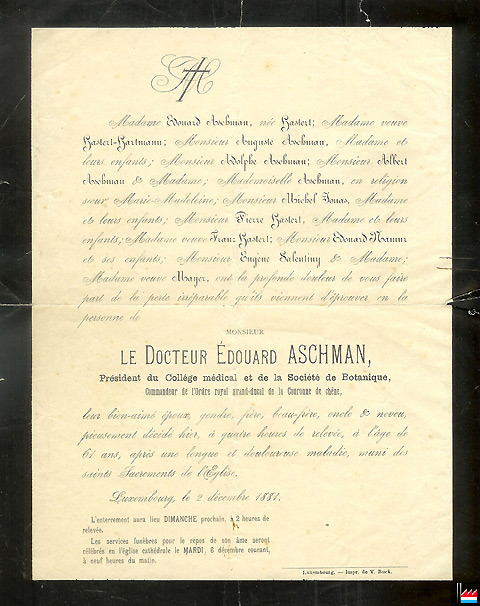 | 22.9.1880 | Edouard Aschman, médecin; co-fondateur de l'association anonyme dite «Casino de Luxembourg» | ||