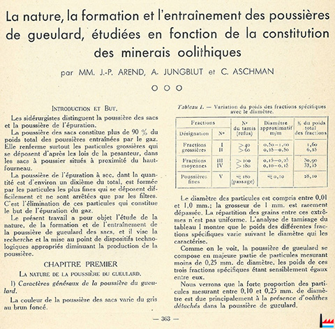 1935 - La nature, la formation et l’entraînement des poussières de gueulard, étudiées en fonction de la constitution des minerais oolithiques par MM. J.-P. Arend et A. Jungblut et C. Aschman - Mémoire - Extrait de la « Revue de Métallurgie », XXXIIe année, Paris IXe, 1935, p. 363 à 392.