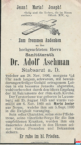 | 9.6.1824 | Danksagung: „Ich fühle mich verpflichtet, den königlichen preußischen Stabs-Arzt, Herrn Aschmann hier selbst, für das äußerst geschickte und schmerzlose Befreien von einem kranken Zahn, meinen innigsten Dank öffentlich abzulassen. Zugleich kann ich den Wunsch nicht unterdrücken, dass der Stabs-Arzt Aschmann die Güte haben möchte, sein wirklich großes Talent, welches er bisher nur Bekannten aus Gefälligkeit widmete, gemeinnütziger werden zu lassen; denn wahrlich ist es dem Zahnpatienten die große Wohltat, von einem kranken Zahne so schnell und so glücklich befreit zu werden, dass man fast glaubt, der kranke Zahn wäre seinem Arzt schon entgegengekommen.“ Luxemburg, den 9. Juni 1824, Brèe (Ausstellung in der Abtei Neumünster in Luxemburg „Präsenz, Wirken und Integration von Deutschen in Luxemburg - Vom Wiener Kongress bis zum Ersten Weltkrieg, 1815 -1914“ - Deutscher Verein in Luxemburg, 7. März 2013 bis 7. April 2013 ) |