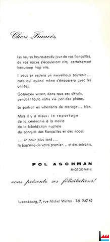 Pol Aschman, maître-photographe, 7 rue M. Welter, Luxembourg, se recommande pour les photos de votre stand à la Foire de Luxembourg.