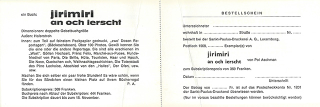1970 | Imprimerie Saint-Paul S.A., Luxembourg | Göllen Hochzeit - Letzte Zwanzig Jahre ... - Der Ofen - Abschied von den „Hallen” - Les puces - 14 Auer 22: „Et ass Fre’jor“ - Pällem - Klippschule - Hüte - Der Hundefriedhof von Paris - Lieben Sie Haydn? - Foire Internationale - Haar und Hasch - Touristen - Fo’er `68 - Quetschen och! - Bicher zuhaaf - „Gléw Dir nach un de Klés`chen? - Zentralfriedhof Wien - „LX 16000, ahoi!“ - Die Totenstadt des Père Lachaise - Türkisch - Weihnachtsgeschichten - Knipsgeschichten - Die Brille - Die Nase. |