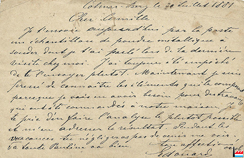 Je t’envoie aujourd’hui par la poste un échantillon de poudre métallique à souder dont je t’ai parlé lors de la dernière visite chez moi. J’ai toujours été empêché de te l’envoyer plutôt. Maintenant je suis pressé de connaître les éléments qui la composent parce que je vais en avoir besoin pour les travaux qui ont été commandés à notre maison. Je te prie d’en faire l’analyse le plutôt possible et m’en adresser le résultat. Pendant les vacances tu négligeras pas de venir me voir. Ta tante Pauline va bien.