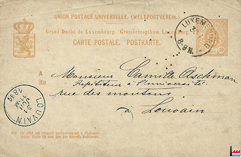 Carte postale d’Édouard Kuntgen-Kieffer, comptable à l’Usine de Colmar-Berg, à son neveu Camille Aschman, répétiteur de chimie générale à l'Université catholique de Louvain.