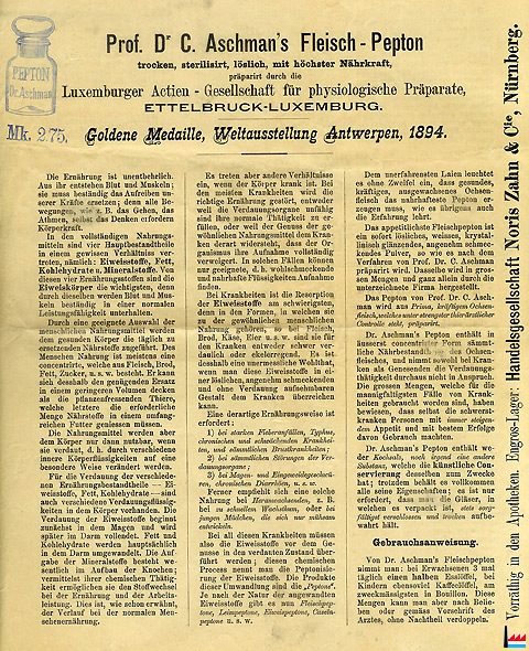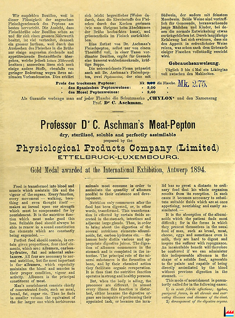 Prof. Dr. C. Aschman's Fleisch-Pepton trocken, sterilisirt, löslich, mit höchster Nährkraft, präpariert durch die Luxemburger Actien-Gesellschaft für physiologische Präparate, ETTELBRUCK-LUXEMBURG. Goldene Medaille, Weltausstellung Antwerpen, 1894. |