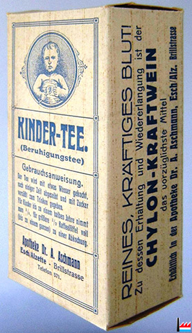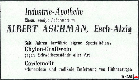 | Juin - juillet 1927 | Kraftwein mit Fleischextrakt nach in Deutschland, Frankreich, Belgien und Luxemburg patentierten Verfahren hergestellt. - Höchste Heilwirkung. - Apotheke und Laboratorium A. ASCHMAN, 2303 (Tageblatt 29 juin, 5 et 12 juillet 1927) |