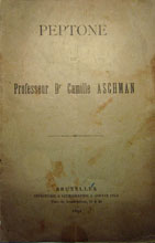| mai 1892 | Publication à Bruxelles de la brochure « Peptone du Professeur Dr. Camille Aschman » en vue de trouver des investisseurs pour l'installation et l'exploitation d'une fabrique de peptone. « … Étant donné le prix des peptones existantes, le bénéfice net est considérable. D’après notre exposé, les peptones sont des produits d’un grand avenir, et qui seront de plus en plus prescrites dans la pratique médicale. Elles sont appelées à rendre d’immenses services dans une foule de maladies, lorsqu’elles seront mieux connues, et leurs qualités appréciées. » Dr. C. Aschman. Bruxelles, Mai 1892. (p. 9 et 10) |