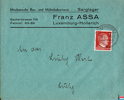 | <=1943 | ![]() Assa Franz, Hollerich / Luxemburg (Enveloppe 1943 - Collection: industrie.lu) Mechanische Bau- und Möbelschreinerei - Sarglager Escherstrasse 119 Fernruf: 6388 |