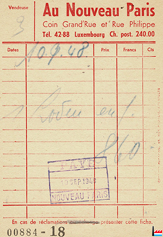 | 1948 | ![]() Au Nouveau Paris, Luxembourg, coin Grand'rue et rue Philippe, tél: 4288 (Collection: industrie.lu) |