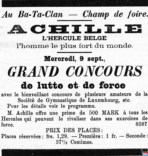 ![]() Achille, l'hercule belge, l'homme le plus fort du monde, au Ba-ta-clan, Champ de foire, Luxembourg (LIL: 8.9.1885) |