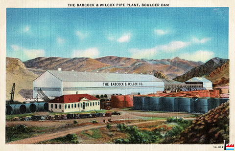 ![]() Babcock & Wilcox Pipe Plant, Boulder Dam (Nevada / USA) (Carte postale: collection: industrie.lu) The Babcock & Wilcox Pipe Plant - the penstock pipes at Boulder Dam were too large to be railroads, so this plant was built to fabricate the largest penstock pipes in the world. |