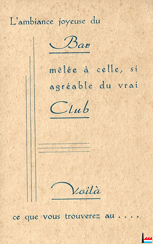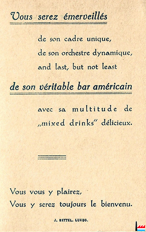 Eröffnung des "St. James‘ Club" Für Samstagabend waren wir zur Eröffnung des "St. James' Club", des gediegenmodernen neuen Club-Lokals mit Bar und Orchester, am Pariser Platz zu Luxemburg eingeladen. Herr Paul Thein, Besitzer des bekannten "Hotel Moderne" ließ unter Leitung des Architekten Arthur Thill, das Erdgeschoß des Hotels umbauen zu einem stilvollen modernen Clubraum. Die Eröffnung fand bei regem Andrang des Publikums statt. Die von Neonlicht überflammte Entrée ist jetzt direkt an den Pariser Platz verlegt. Nach der Entrée biegt man rechts in den Clubraum ab, während es geradeaus zum Entrée-Hall und Hotelbüro geht. (…). (t: 2.9.1947) |