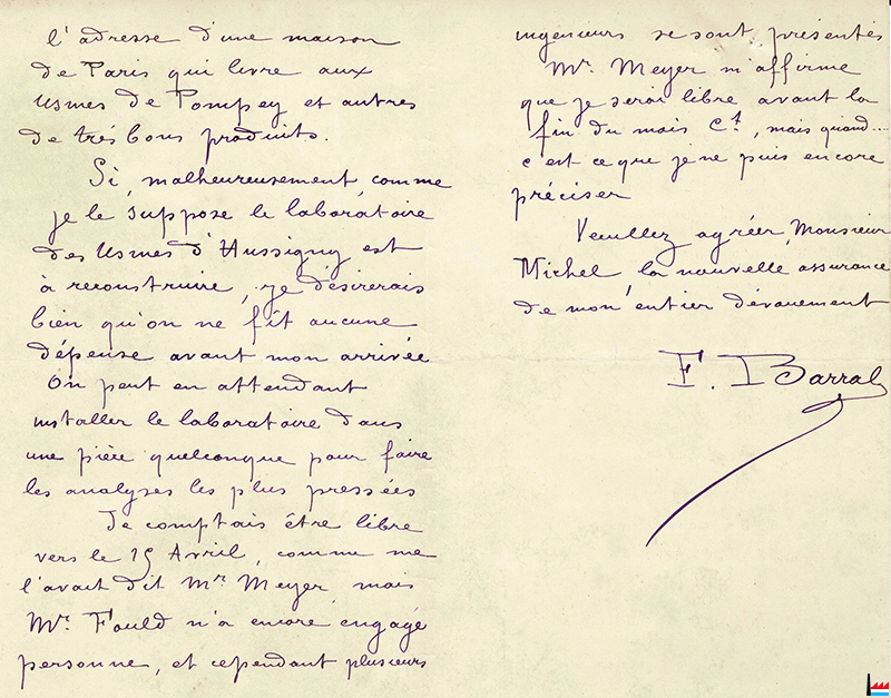 Lettre du 20.4.1898 de F. Barral, ingénieur chimiste à l'Usine de Pompey à M. Michel, président du Conseil d'administration de l'Usine de Pompey (Collection: industrie.lu)