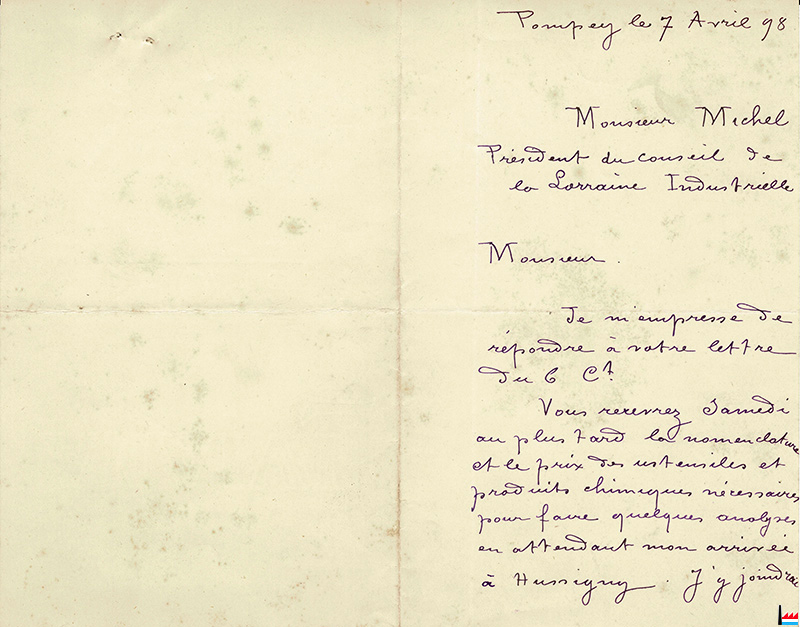Lettre du 7.4.1898 de F. Barral, ingénieur chimiste à l'Usine de Pompey à M. Michel, président du Conseil d'administration de l'Usine de Pompey (Collection: industrie.lu)