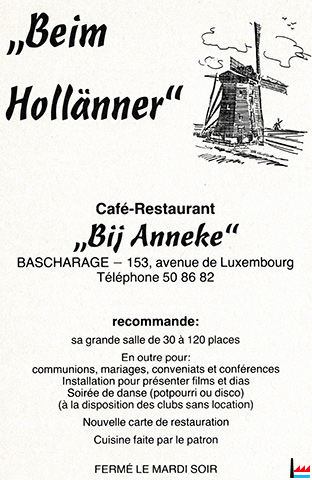 | <=1986 | ![]() Café - Restaurant "Beim Hollänner", Bascharage, 153 avenue de Luxembourg, Bij Anneke, tél: 508682, grande salle de 30 - 120 places - 1986 (Collection: industrie.lu) |