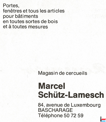 | <=1969 | Schütz - Lamesch Marcel, 95 route de Luxembourg, Bascharage, tél: 507259 Menuiserie - Möbelschreinerei |