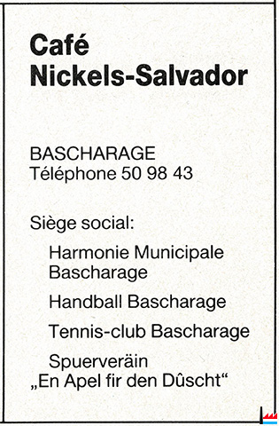 | 16.5.1968, 1972 | Café du Centre, Bascharage tél: 509684 |