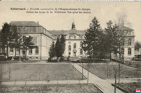 Echternach, Hospice - Clinique St. Georges, datant des temps de St. Willibrord - nouvelle construction - vue prise des jardins (Carte