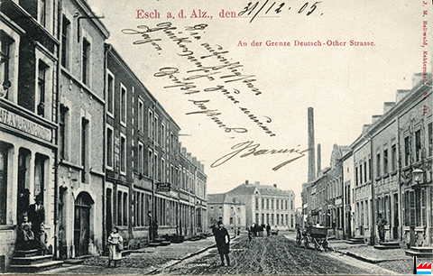 Café A. Warnant-Zeimet, Esch/Alzette, rue d'Audun (N°?) Frontière - an der Grenze - Deutsch-Other Strasse <= 12.1905 (Carte postale: J.M. Bellwald, Echternach, No 411; Collection: industrie.lu)