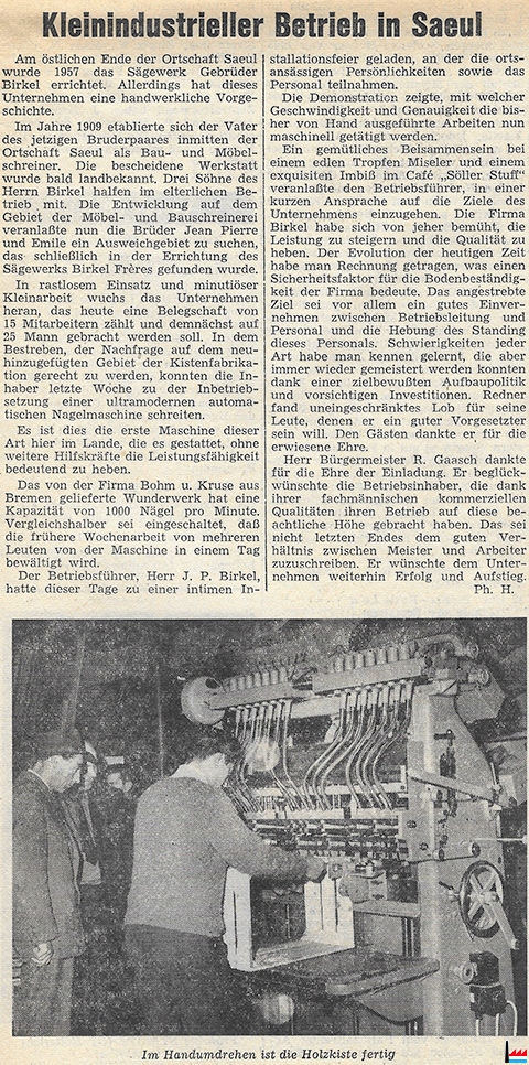 | 1963 | ![]() Caisserie BIRKEL, Saeul (LW: 16.11.1963 p.19; Scan: Fernand Toussaint) Automatische Nagelmaschine Bohm & Kruse, Bremen |