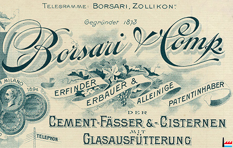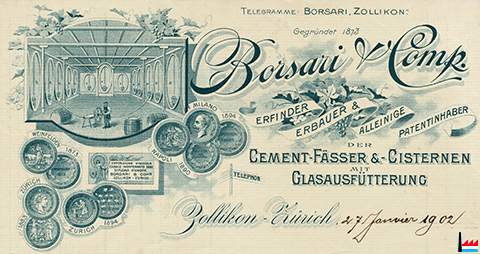 | <=1902 | ![]() Borsari & Comp, Zollikon - Zürich (Collection: industrie.lu) Erfinder, Erbauer & Alleinige Patentinhaber der Cement-Fässer & - Cisternen mit Glasausfütterung |