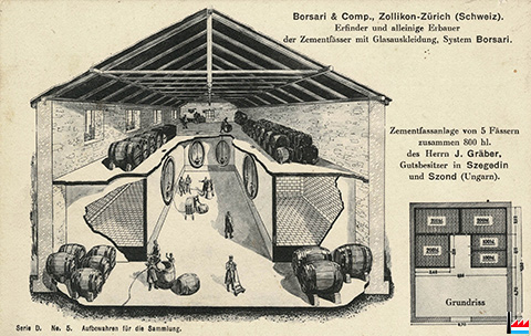 | 1885 | Die Weingroßhandlung M. Bauer in Wien-Simmering hat durch die Cementfassfabrik von J. Borsari & Co. in Zollikon-Zürich in ihren großen Kellereien 5 Cementfässer mit einem Gesamtfaßraume von 1.200 Hektoliter herstellen lassen. Die Cementfässer sind innen ausgeglast, so daß sie sich innen mit Bürste und Wasser recht sauber halten lassen. (OMZ: 29.7.1885) |