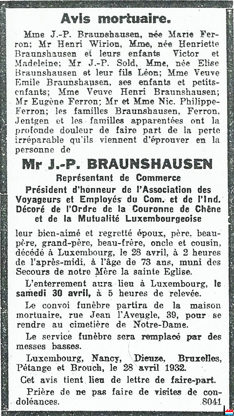 1932 - Décès à Luxembourg, 39, rue Jean l’Aveugle, le 28 avril 1932 à l’âge de 73 ans de J.-P. Braunhausen, représentant de commerce, président d’honneur de l’Association des voyageurs et employés du commerce et de l’industrie, époux de Marie Ferron.