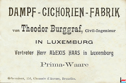 Dampf-Cichorien-Fabrik von Theodor Burggraf, Civil-Ingenieur in Luxemburg. Vertreter Herr Alexis Haas in Luxemburg.