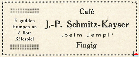| <=1962 | Café Schmitz-Kayser J. P., Fingig, tél: 38110 (Schmitz-Peltier Aug., succ. Jempy Schmitz, Fingig, tél. 38042, achat et vente de produits agricoles) |