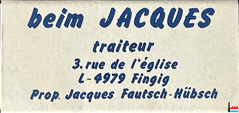 | <=1958 | Café Schmitz-Kayser J.P., Fingig, tél: 38110 (Schmitz-Peltier Aug., succ. Jempy Schmitz, Fingig, tél. 38042, achat et vente de produits agricoles) |