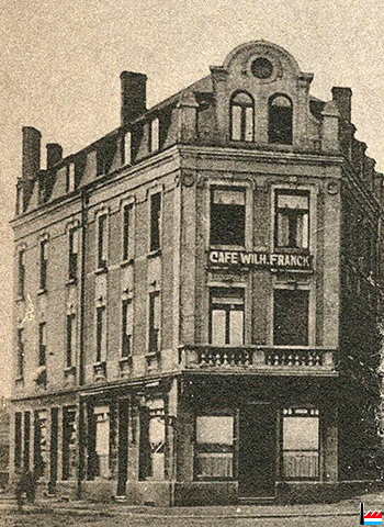 Café Wilh. Franck, Esch/Alzette, coin Boulevard Prince Henri - (1?) rue Adolphe-Emile / Adolph-Emil-Strasse (rue de Stalingrad) (Extrait de la Carte postale: Papiers en gros P. Houstraas, Luxembourg-Gare, Nr 44; Collection: industrie.lu)