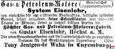 | 1894 | ![]() Gas- & Petroleum-Motore System Eisenlohr Höchster Gas- & Petroleum-Motoren-Fabrik von Gustav Eisenlohr, Höchst/Main Vertreter für das Großherzogtum Luxemburg: Tony Jentgen-de Waha, Luxemburg (OMZ: 2.11.1894) |
