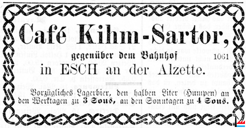 | <=1885 | ![]() Café Kihm - Sartor, gegenüber dem Bahnhof, Esch/Alzette (OMZ: 20.5.1885) |