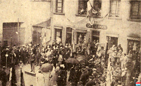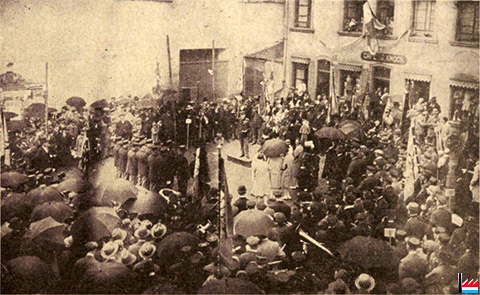 75st Stöftungsfest vun den stâdtgrönnesche Pompjéen, den 22. Juni 1929 - Les discours sur la Place publique «D'Schmëtt» - Die Reden «op der Schmëtt:![]() Was das Forum für das alte Rom war, das ist von jeher die «Schmött» für die Unterstadt Grund. All dasjenige, welches nicht «op der Schmött» seine Weihe erhält, das zählt kaum für «dé äl Grönnesch» - Gegenüber der Alzette-Brücke, genau am Ende der Tilleschgâß (frühere rue de Thionville) und am Fuße des «Grönnesche Bierg», befindet sich ein Einschnitt, und der hierdurch entstandene kleine öffentliche Platz heißt «op der Schmött.» (L'Illustré Luxembourgeois: 25.6.1929) |