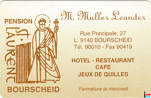 | <=1961 | Café - Pension St-Laurent, Bourscheid, propr. Huberty-Wolter Ad., tél: Turmes Bourscheid 80110 |