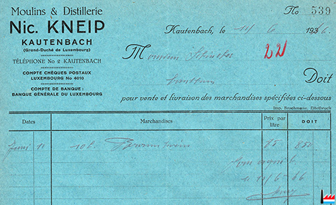 | 6.1946 | ![]() Moulins & Distillerie Nic. Kneip, Kautenbach - facture à M. Schinker, Consthum - pour 10 l Branntwein (Collection: industrie.lu) |