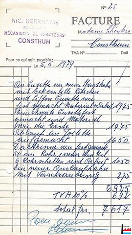 | <=1979 | ![]() Herrmann Nic., forgeron, mécanicien de tracteurs, Consthum - facture à Mme Schinker, Consthum (Collection: industrie.lu) |