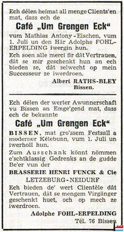 | 5.1945 | ![]() Réouverture: Café Grengen Eck, Bissen (D'Unio'n: 19.5.1945) Propriétaire: Metty Antony - Eischen - de gringe Mett Café, Ustreicherei a Glaserei |