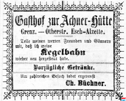 | <= 5.1909 | ![]() Gasthof Zur Achner Hütte, Esch/Alzette, Grenz - Otherstraße (Arme Teufel: 16.5.1909) Propr. Ch. Büchner |
