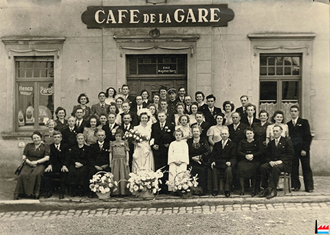Hochzäit Michel Reuter - Juliette Kugener, virum Café de la Gare zu Hoen - ~1946 (Collection: industrie.lu)