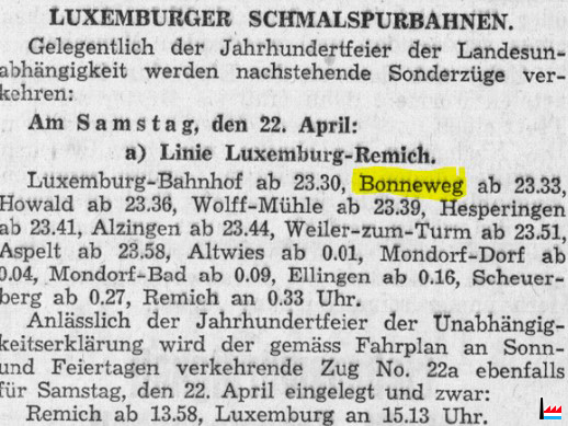 | 22.4.1939 | ![]() Halt Bonneweg - Fahrplang der Sonderzüge der " Jangeli" - Linie Luxemburg - Remich gelegentlich der Jahrhundertfeier der Landesunabhängigkeit vom 22.4.1939 (t: 19.4.1939) |