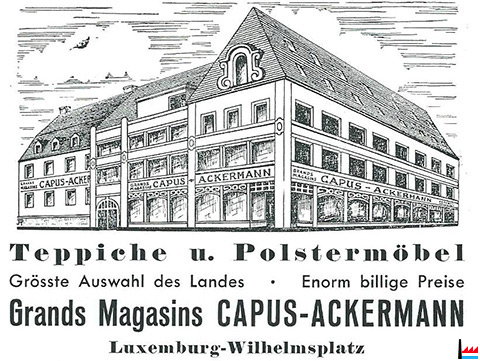 | <=1953, 1955 | ![]() Grands Magasins Capus - Ackermann, Luxemburg - Wilhelmsplatz Dans: Fanfare municipale Luxembourg-Pfaffenthal 1905 - 1955 - 50e anniversaire (Collection Philippe Aschman) |