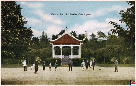 Pavillon chinois dans le Parc municipal, Esch/Alzette - Chinesischer Pavillon - 1936 (Carte postale: Edition Jung frères - FRÉJU, Esch/Alzette - Edition W. Capus, Luxembourg; collection: industrie.lu)