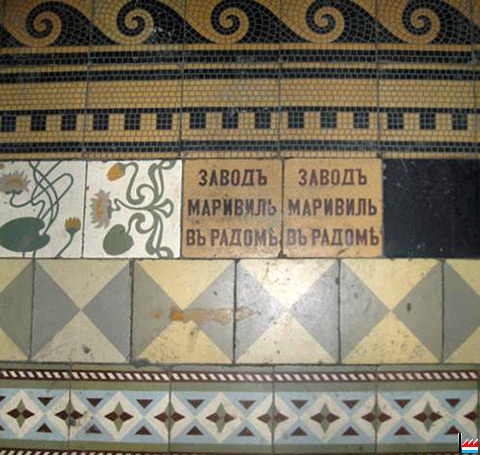 Ausschnitt aus dem Bodenmosaik des Bahnhofs Pischpek. Diese Keramik wurde bis 1914 hergestellt, als Polen Teil des Russischen Reiches war. (Den dritten Satz verstehe ich nicht ganz, wahrscheinlich wurde der Boden unter den Öfen im Bahnhof gefliest. Sachlich richtiger ist: Radom gehörte zu Russisch-Polen.) (Info: Henning Hraban Ramm)