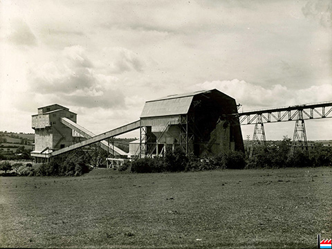 S.A. des Carrières de l'Ouest Voutré (Mayenne): Basculeur du skip - goulotte d'alimentation et concasseur primaire ARBED Dommeldange CMR 150 (Photo collection: industrie.lu)