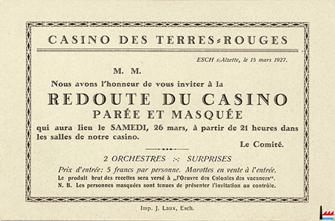 | 26.3.1927 | ![]() Casino des Terres Rouges, Esch/Alzette - Redoute du Casino paréee et masquée - Imprimerie J. Laux, Esch (Collection: industrie.lu) 2 orchestres |